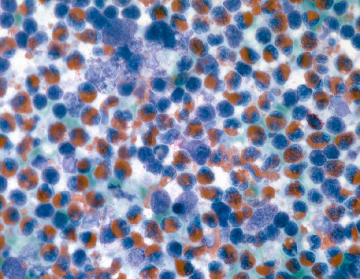 Rund 4-5% aller Pleuraergüsse sind eosinophile Ergüsse mit einem Eosinophilenanteil von mehr als 10% der Zellen. Meist sind auch Lymphozyten und Mastzellen vermehrt. Manchmal findet man zahlreiche Charcot-Leyden'sche Kristalle. Das ätiologische Spektrum ist breit. Eosinophile Ergüsse lassen sich beobachten bei Spontanpneumothorax, Blutung, subakuter Entzündung, Parasiten oder idiopathisch.