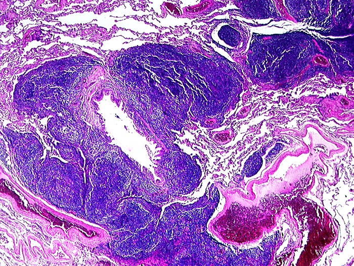 Dichtes Lymphominfiltrat entlang der Lymphspalten um einen Bronchiolus.