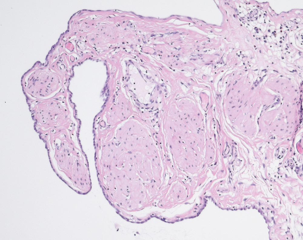 Mesothelausgekleidete Zyste des Processus vaginalis peritonei und Anteile des Ligamentum rotundum.