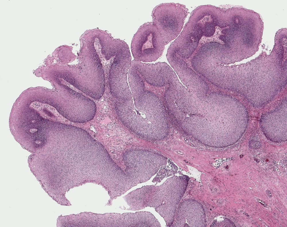 Verzweigende exophytische Proliferate mit fibrovaskulären Stromastielen bedeckt von stark verdicktem gut differenziertem nicht verhornendem Plattenepithel.