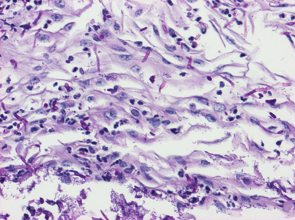 Das oberflächliche Plattenepithel der Ösophagusschleimhaut ist diffus durchsetzt von Soorpseudohyphen und Sporen sowie sehr zahlreichen Stäbchenbakterien. Wenig neutrophile Granulozyten.