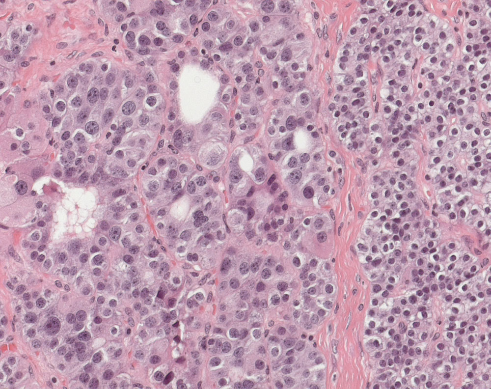 Atypisches Adenom der Nebenschilddrüse mit schmaler Kapsel, breiten fibrösen Septen und ausgeprägten Zellatypien mit Makronukleolen. Gewicht: 3g. Max. Durchmesser: 13mm. Kein invasives Tumorwachstum. Kein Kapseldurchbruch. Keine Gefässeinbrüche. Keine Nekrosen. 1 Mitose auf 10 HPF. Proliferationsrate (Ki-67): <1%.
