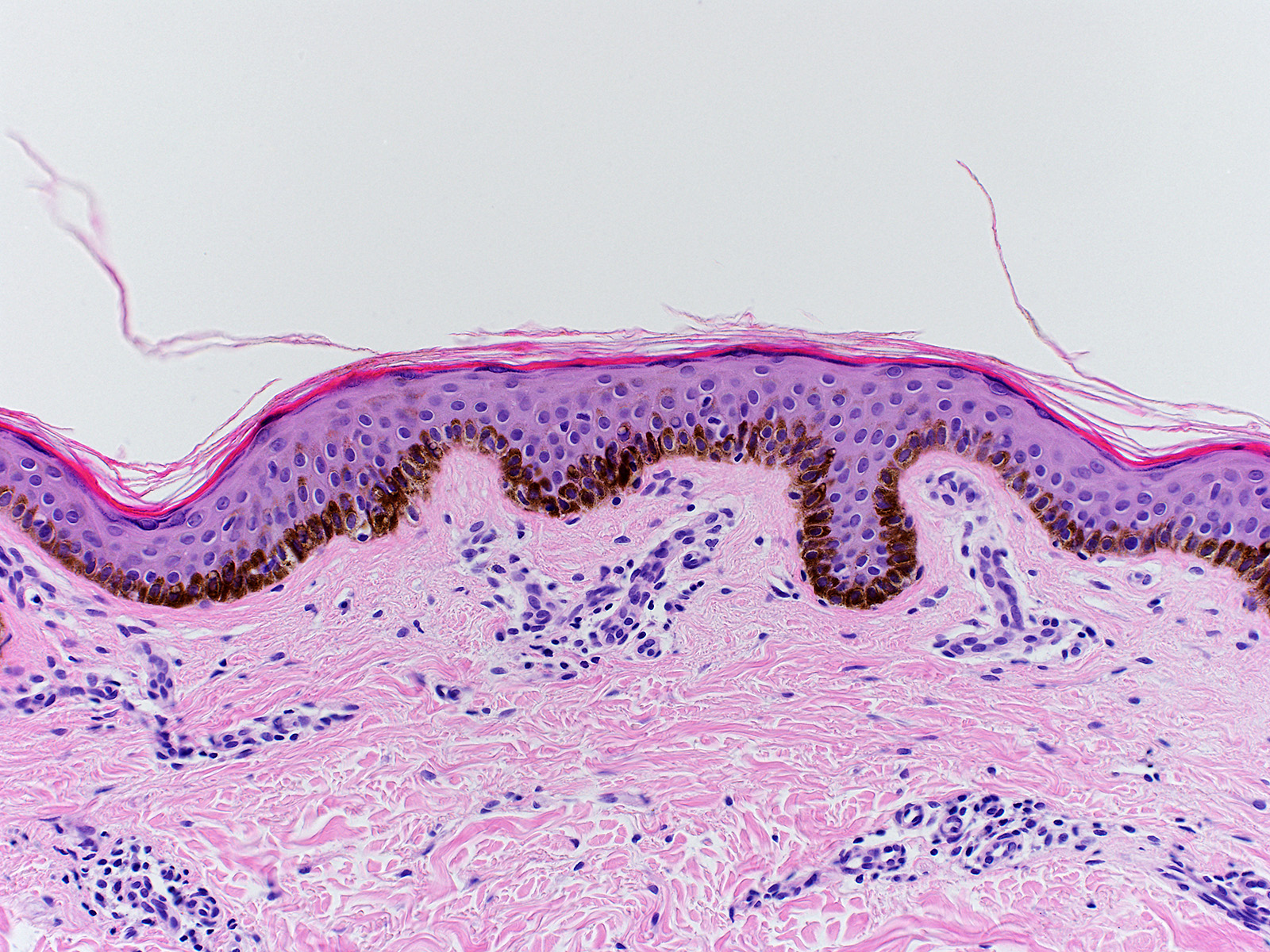 Normale Haut eines Patienten schwarzer Hautfarbe. Die Melanozyten sind nicht vermehrt, produzieren aber grosse Mengen Melaninpigment, die an die Keratinozyten der basalen Epidermis abgegeben werden.