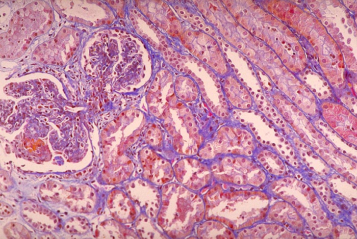 Initial Glomerula vergrössert, blutarm, Schlingen ausgefüllt von gelapptkernigen Leukozyten und Monozyten. Später Mesangiumverbreiterung infolge Zellvermehrung (Mesangiumzellen und Monozyten). Keine mesangiale Matrixvermehrung. Glomerulumschlingen zum Teil wieder bluthaltig, teils von Monozyten angefüllt. Selten grosse, irregulär verteilte, subepitheliale Depots erkennbar.