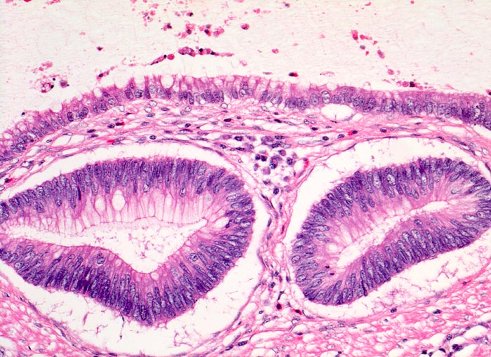 Oben im Bild eine zystisch dilatierte Drüse. Unten im Bild zwei kleinere Tubuli ausgekleidet von geringgradig atypischem Kolonepithel.