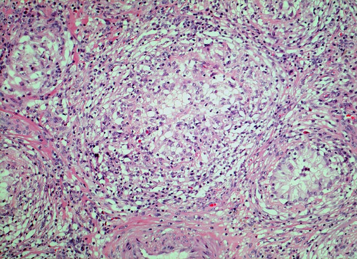 Im Gegensatz zur infektiösen Orchitis finden sich neben interstitiellen auch intratubuläre Entzündungsinfiltrate und die Entzündung ist meist nur einseitig. Meist finden sich nur angedeutete Granulome bestehend aus Histiozyten und Riesenzellen.