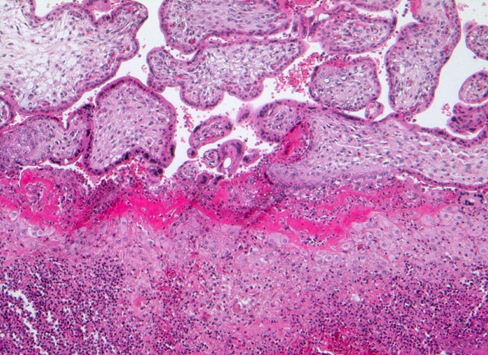 Einschmelzende Entzündung im Bereich der Dezidua basalis. Daran angrenzend gut erhaltende Plazentarzotten aus Frühschwangerschaft.