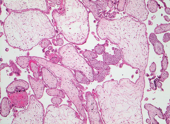 Gestörte Zottenverzweigungen. Mangelhafte Vaskularisation und hydropische Umwandlung des Stromas der Plazentarzotten. Trophoblast über weite Strecken einreihig und abgeflacht.