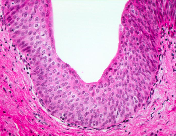 Regelmässiges mehr als 7 reihiges Urothel ohne Dysplasie. An der Oberfläche einlagige Deckzellschicht mit dichterem Zytoplasma.