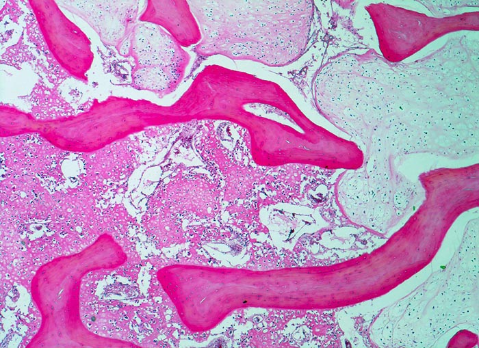 In der Übersicht ist die scharfe Grenze zwischen hochdifferenziertem Chondrosarkom (rechts) und dedifferenzierter Osteosarkomkomponente (links) sichtbar.