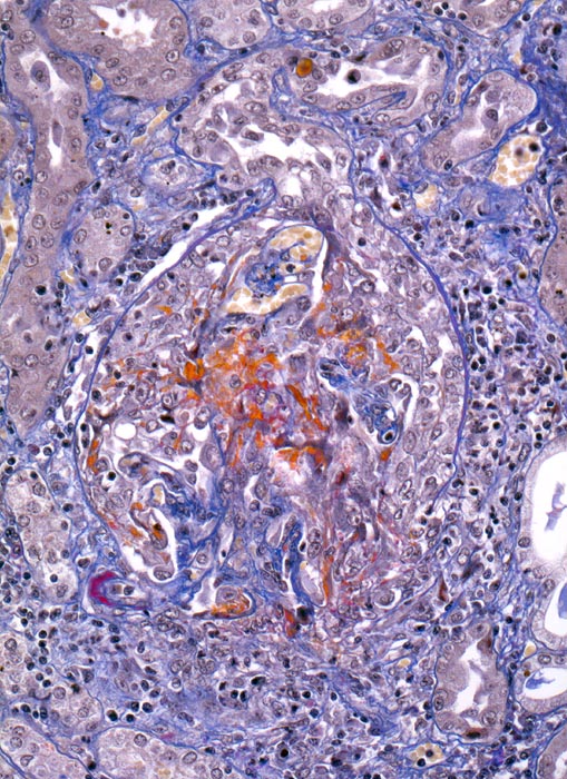 Glomerulum mit Harnpol und Gefässpol mit geringer Arteriolosklerose des Vas afferens. Ausgedehnte Schlingennekrosen mit Exsudation von Fibrin und Ausbildung eines frischen rein proliferativen globalen Halbmondes. Einzelne erhaltene Schlingen sind ausgeweitet. Über der Schlingenruptur ist auch die Bowman'sche Kapsel rupturiert. An dieser Stelle findet sich eine periglomeruläre chronische Entzündung.