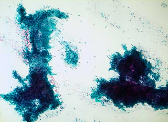Feinnadelpunktat der Speicheldrüse: Palmwedelartige Formationen aus verzweigter fibrillärer Matrix und aufsitzenden Epithelien ohne Atypie.