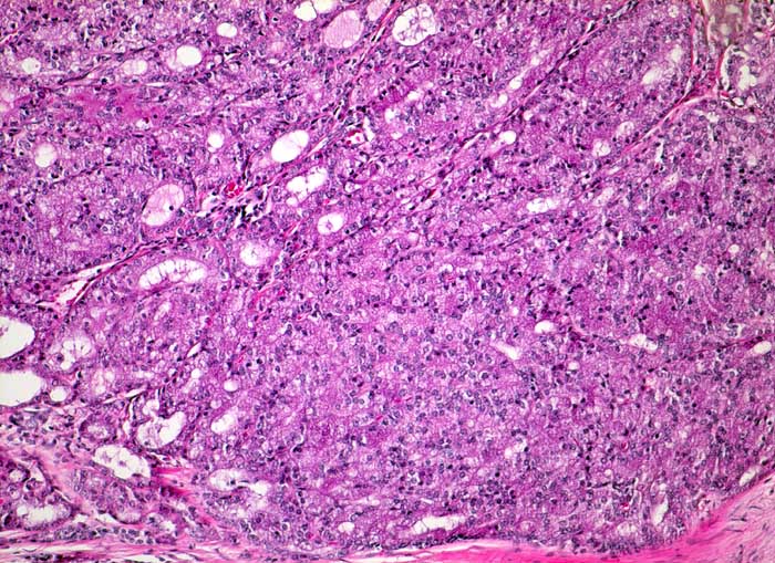 Azinär differenzierte Tumorzellen mit reichlich wolkigem feingranulärem bzw. retikulärem Zytoplasma. Teils solides, teils follikuläres Wachstumsmuster.