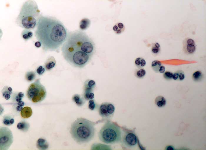 Makrophagen als Zeichen abgelaufener alveolärer Blutungen und zahlreiche