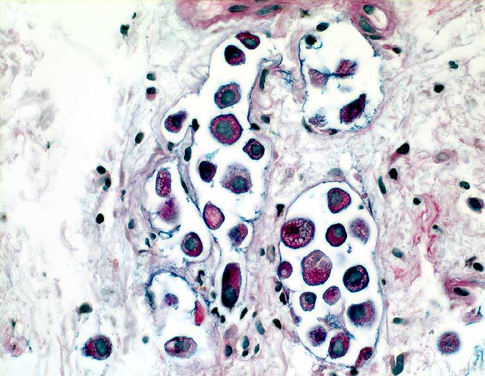 Einzeln im Lumen von Lymphgefässen liegende Tumorzellen mit reichlich intrazellulärem Schleim.