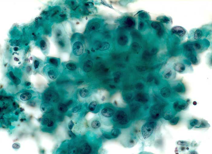 Zytologische Diagnose: Zahlreiche Zellen eines teils verhornenden Plattenepithelkarzinoms. Ausserdem Zellen vom Typ eines Adenokarzinoms.