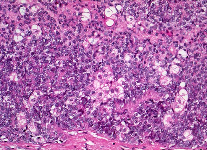 Grosser solider Verband aus gering differenzierten, monomorphen basaloiden Zellen mit Einschluss von einzelnen Zellen und kleinen Zellgruppen mit breitem, hellem, grob vakuolisiertem Zytoplasma.