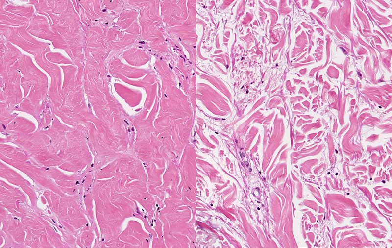 Verdickung, Verplumpung und Hyalinisierung der Kollagenfasern bei der Morphea (links). Normale retikuläre Dermis zum Vergleich rechts.
