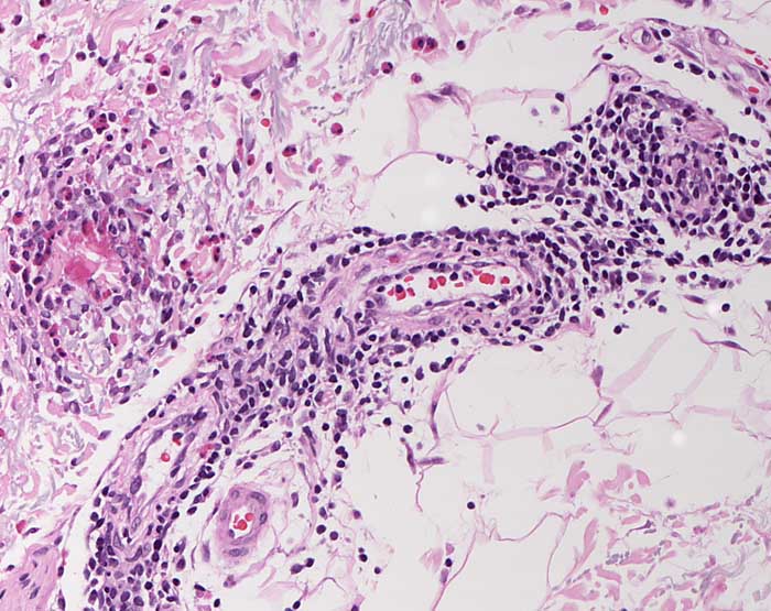 Bis in die Subkutis reichendes eosinophilenreiches perivaskuläres und interstitielles Infiltrat. Einzelne Plasmazellen. Links im Bild eine Flammenfigur bestehend aus zerfallenden eosinophilen Granulozyten, die um degenerierte Kollagenfasern angeordnet sind.