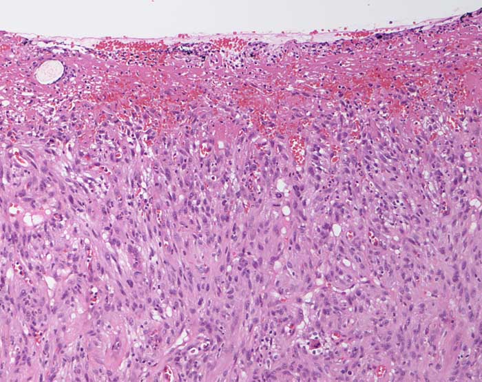 Breitflächig ulzerierter spindelzelliger Tumor mit einzelnen Mitosen und mässiggradiger Zellpleomorphie.