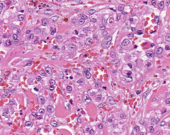 Irreguläre blutgefüllte Gefässräume ausgekleidet von sehr grossen atypischen epitheloiden Endothelien mit vesikulärem Kern und grossem Nukleolus. Die Gefässlumina der atypischen Gefässe sind kaum erkennbar und können zur Verwechslung mit einem wenig differenzierten Karzinom oder malignen Melanom führen. Siderinablagerungen.