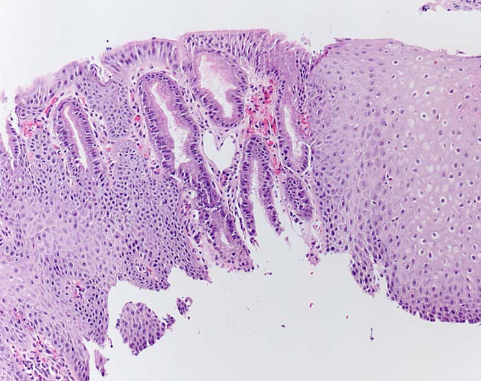 Die distale Ösophagusschleimhaut zeigt zwischen Plattenepithl eine kurzstreckige Zylinderzellmetaplasie ohne Becherzellen (Schleimhaut vom Kardiatyp ohne Becherzellen oder magenspezifische Drüsen) mit Einblutung. Leichte Hyperplasie der Basalzellen, aber kaum Entzündung.