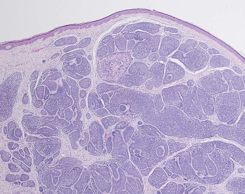 Dermaler Tumor ohne Beziehung zur Epidermis. Ovale und polygonale mosaikartig angeordnete Tumorzellnester werden eingefasst von von hyalinen Bändern (Typ IV Kollagen). In der Peripherie kleine stark basophile Tumorzellen mit angedeuteter Palisadierung. Im Zentrum etwas grössere blassere Zellen und kleine Lumina.