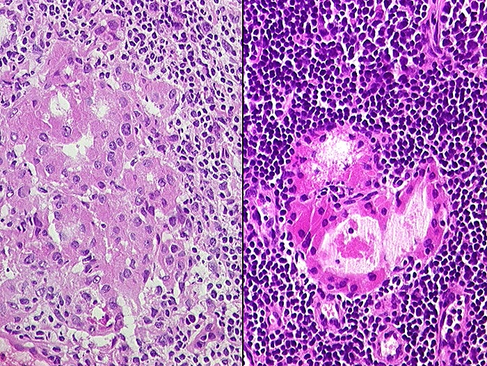 Im lymphozytären Entzündungsinfiltrat eingebettet liegen Follikel mit onkozytärem Epithel (reichlich hypereosinophiles fein granuliertes Zytoplasma). Links der Gefrierschnitt. Rechts der Einbettschnitt.