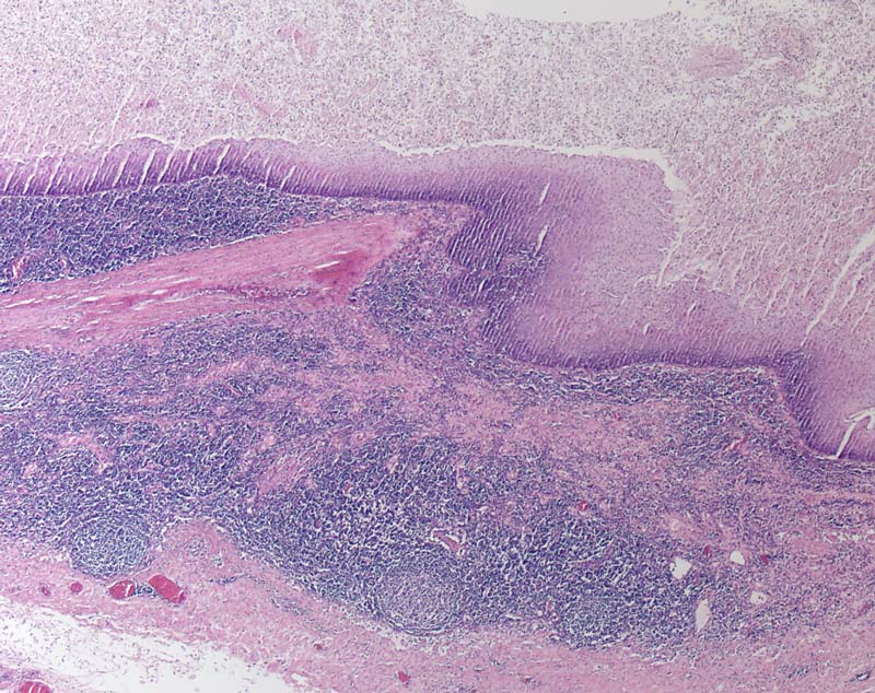 Auskleidung meist durch Plattenepithel, seltener durch Flimmerepithel. Dichtes lymphozytäres Infiltrat in der Zystenwand im Gegensatz zur bronchogenen Zyste.
