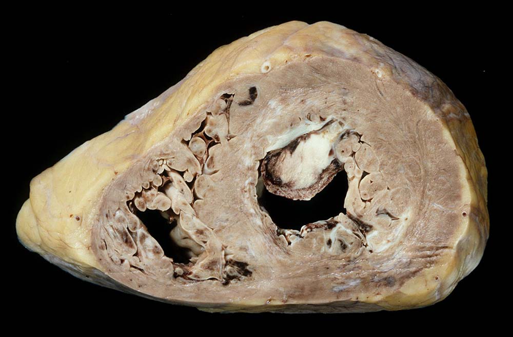 Wandhaftender Thrombus (3cm) der linken Vorderwand. Biventrikuläre, links asymmetrische, rechts exzentrische Myokardhypertrophie. Infarktnarbe in Hinterwand und posteriorem Septum. Grobfleckige Myokardfibrose des linken Ventrikels.