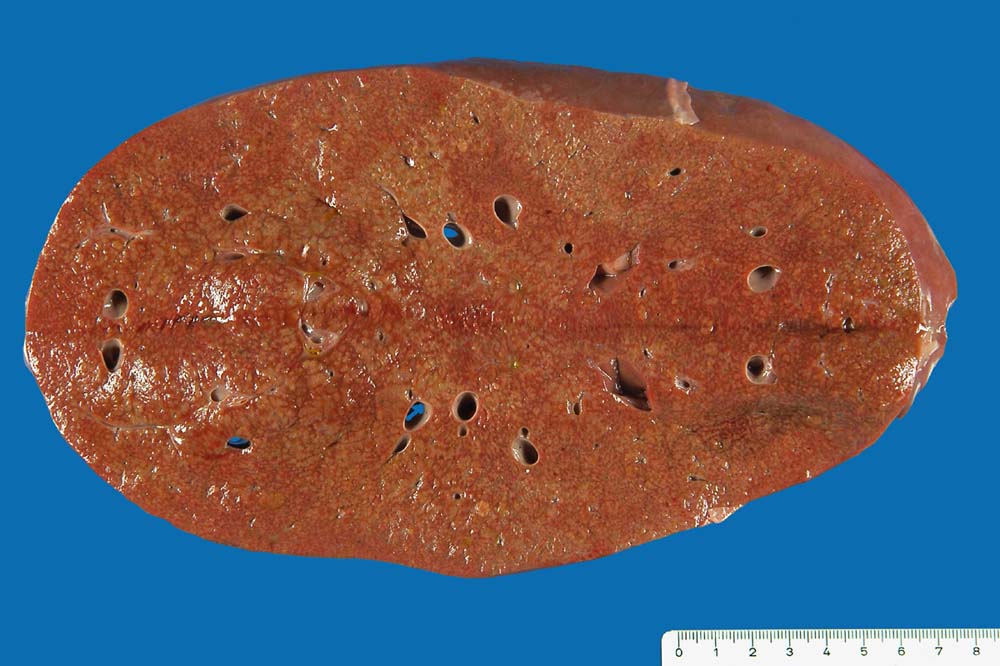 Die chronisch gestaute fibrosierte Leber zeigt eine feinknotige Struktur.