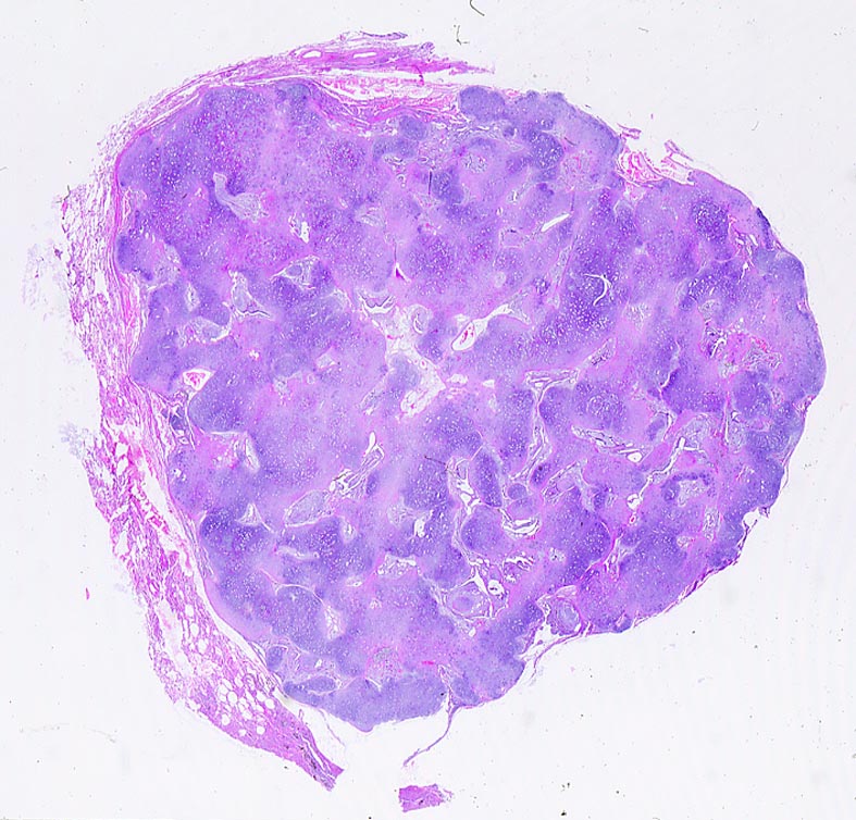Scharf begrenzter Tumor überwiegend bestehend aus Knorpel . Zwischen den Knorpelspangen schlitzförmige von Epithel ausgekleidete Hohlräume.