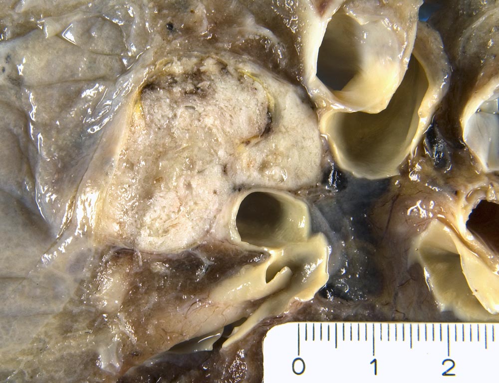 Lungenmetastase infrahilär rechts, Dm 6 cm mit Tumorinfiltration des Bronchus.